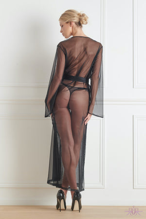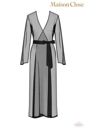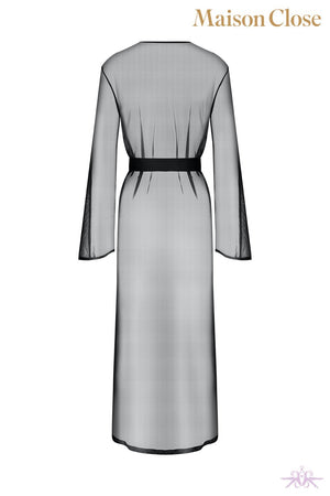A luxurious long sheer kimono from the Madame Reve collection at Maison Close. This transparent tulle gown reveals the body in such elegance and grace. Its gorgeous long wide sleeves and and two discreet side slits bring style and sophistication to your lingerie and nightwear.