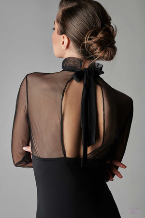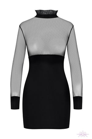 Ultimate seduction in this short dress from the Madame Reve collection at maison Close. Made from a gorgeous mix of luxurious fabric, its gathered transparent mesh top delicately reveals the bust whilst its soft and opaque microfiber molds the shapes and provides good comfort like a second skin. The delicate mesh back is enhanced by a deep neckline and the long sleeves add chic and sophistication along with the ruffled collar that is tied with an opaque microfibre scarf.