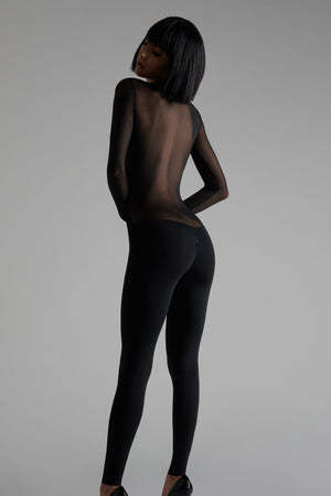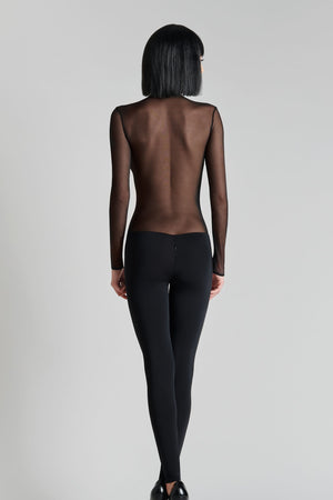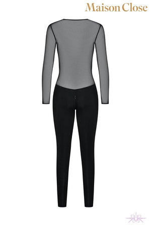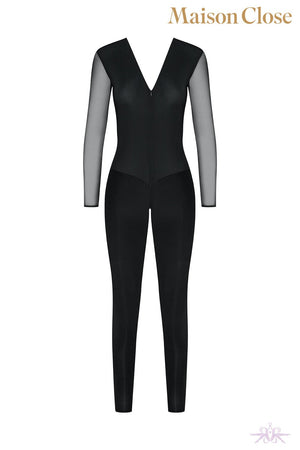 An alluring and seductive catsuit from Maison Close. This close fitting catsuit envelops the curves with a soft and ever so comfortable microfibre. It emphasises the silhouette and flatters the assets like a second skin. Its low cut highlights the bust. The back and the long sleeves are so chic with their transparency. At the front there is a zip which goes to the bottom.