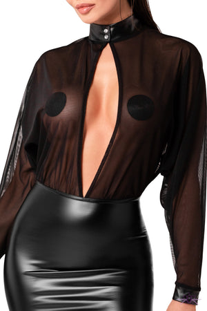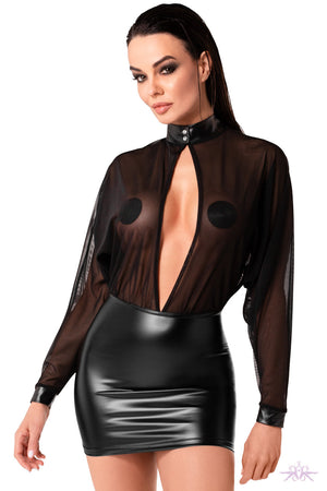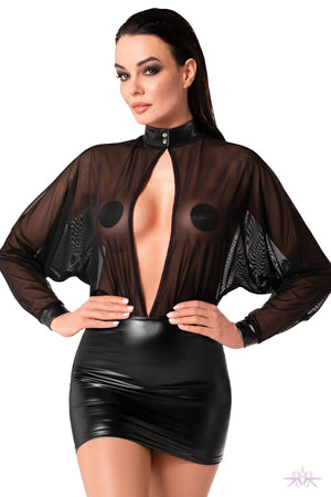 The top is made from transparent, elastic mesh that offers a soft and airy feel. The long sleeves and high neck add a touch of sophistication, while the open front and back design exude boldness. The fitted mini skirt is crafted from Stretchy Power Wetlook fabric, providing a sleek, form-fitting silhouette that contrasts beautifully with the voluminous mesh top. The mesh top features a snap-button collar and cuffs made from the same Wetlook fabric as the skirt, tying the two elements together. The open back and plunging front add an edgy twist to the elegant design, making it perfect for both daring outings and intimate settings.