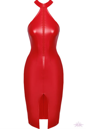 Made from Power Wetlook, a stretchy fabric that is more matte than shiny, ensuring both comfort and style. The dress features a high halter neckline that transitions into a form-fitting silhouette, with a front zipper running from the collar down to the belly button, adding an edgy touch to the design. Designed to accentuate the curves, this dress is perfect for those who want to make a statement. The midi length and central slit at the front add a hint of elegance, balancing the boldness of the zipper detail.