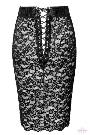 Embrace your wild side with the Noir Handmade pencil skirt. This waist-high, tight skirt in a knee-length design features a seductive mix of materials, with elegant black powerwetlook at the front and delicate lace at the back. The stretchy, comfortable fit and open lacing from waist to bottom create a daring and provocative look.