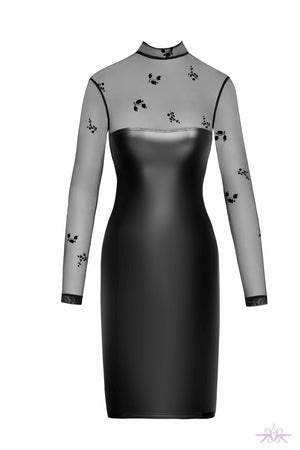 Sophisticate your wardrobe with this long-sleeve flocked mesh and wetlook midi dress. This design emanates elegance and poise with a hidden zipper in the back for ease and a slit up the back of the skirt to show off the legs.