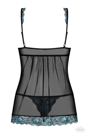Seductive babydoll and thong set from Obsessive. Delicately adorned with black and blue lace and flattering front fastening. Featuring a lace edged thong.