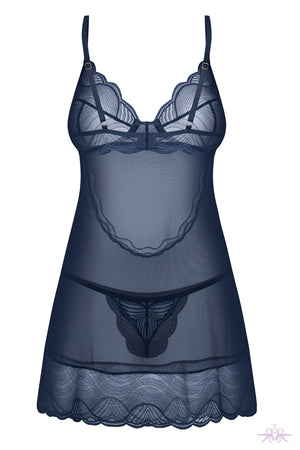 Be daring in the Obsessive Nightly Chemise and Thong set. This sensually elegant set features a short, flared negligee and thong in a sophisticated blue-on-blue color scheme. The sheer tulle and delicate lace details add a seductive touch while the soft and stretchy fabric ensures maximum comfort. With underwire cups and adjustable straps, this set is perfect for creating a beautiful cleavage.
