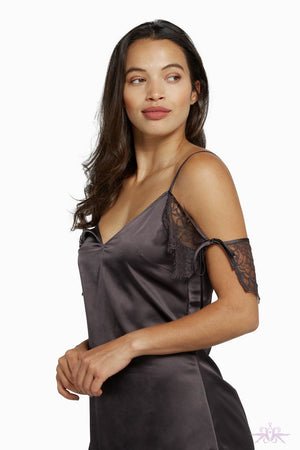 Lounge in style with the Adrienne lace and satin slip from Wolf and Whistle. Flirt in this suggestive lace off the shoulder slip with a delicate lace trim. A subtle v-neck, luxurious thin straps and ties on the sleeves add to the luxurious charm of this night dress.