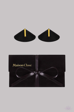 A gorgeous pair of sexy yet minimalist nipple tassels from Maison Close. They are embellished with black satin and feature a golden tassel which adds to their charm. They are stored in a delicate black velvet pouch.
