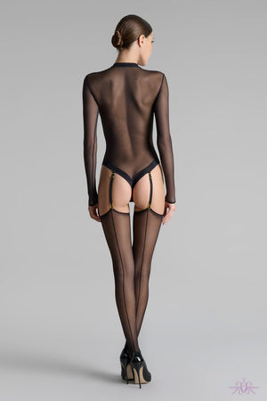 A signature pair of 20 denier seamed 'cut and curled' French stockings from Maison Close. These have a seam to the front and the rear for a graphic style that is elegant and refined. They are soft and silky to the touch and the top of the stockings has no welt, making them perfect for shorter dresses or skirts.
