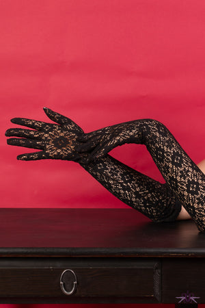 Add a bold vintage touch with What Katie Did Lace Black Gloves. These elbow-length cocktail gloves, crafted from heavy-weight floral lace bring mid-century elegance to cooler days. Their intricate design and daring style make them the perfect statement accessory to elevate any outfit with timeless sophistication.