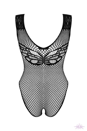 A lovely fishnet bodysuit with a unique bee motif under the breasts and a deep neckline both on the front and on the back attract attention. It will also work great under a jacket or leather biker jacket, worn over underwear. It is seductively crotchless adding to the alluring effect.