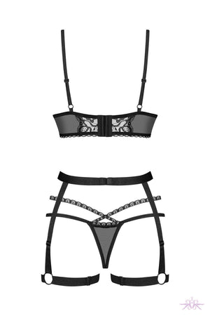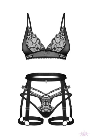 Indulge your senses with the Obsessive Blomentis three piece set. This stimulating lingerie set features a bralette, thong with straps, and a harness with garters. The modern design, crafted from soft lace and transparent mesh, will make you the center of attention. Elevate your confidence and captivate in this tempting ensemble.