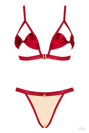 A seductive and extremely attractive two piece set that will definitely excite. It will ignite the fire and desire, seducing with the bows on the breasts and shimmering, golden seams. The set comprises of a cupless bra and matching thong made of tempting satin.