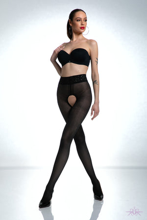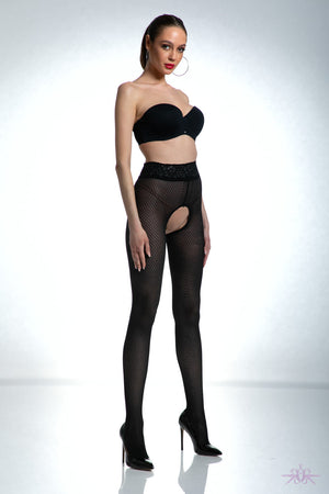 A gorgeous pair of crotchless tights. These 30 denier black tights have a black criss cross patterned design throughout. A stunning lace waistband completes the look of these ornate tights and the open effect at the rear enhances the derriere to perfection.