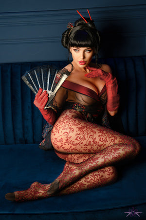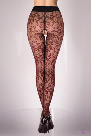 Open tights which are so beautiful from the new Black Secret collection at Ballerina. A sheer leg with a gorgeous design in bordeaux from toe to waist. The open crotch adds the sensual effect.