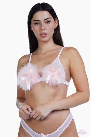 A tantalising baby pink triangle bra to tickle your fancies. Bring out your fun frivolous side with this gorgeous little sheer bra with feather powder puffs and satin bows. A triangular cut non-wired bra with an elasticated satin band. Add some Ooh La La to your lingerie collection. Matching briefs are also available.