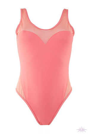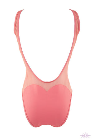A beautiful swimsuit from Playful Promises. The front of the swimsuit has a large opaque pink heart, with a paler mesh on the remainder. It has a low back for showing off that summer tan, and another cheeky heart detail on the bum.