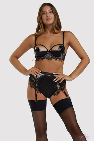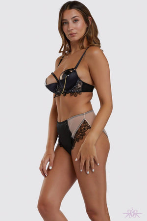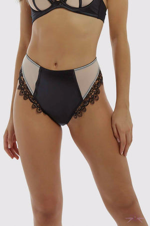 A decadent high waist brief from the Anaise collection. Be sure to make an entrance in these gorgeous briefs featuring a black satin panel with soft lace detailing and beige mesh hips and side panels. Style with the Anaise collection.
