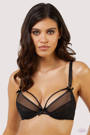 Feel seductive in the Fallon black lace plunge bra, the perfect addition to your lingerie drawer. Black sheer mesh cups and beautiful lace accents create a stunning look. Match this with the fallon suspender belt and choice of thong or high waisted open brief.