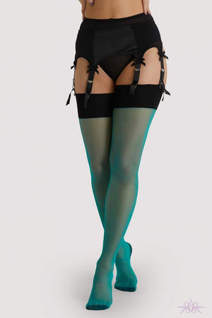 A beautiful pair of vintage seamed stockings from Playful Promises in jade green. These beautiful point heel stockings have a black reinforced heel and toe, a black seam that stops just below the back of the knee and finishes with a tiny black bow. The contrasting black welt completes the look on these lovely stockings.