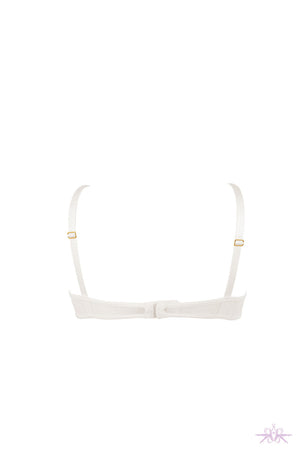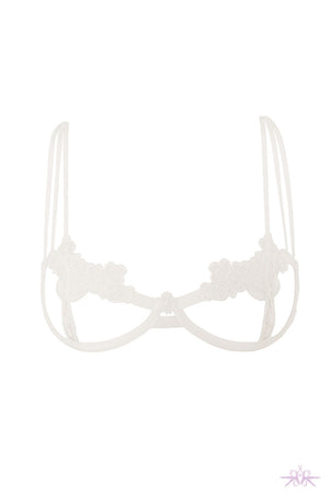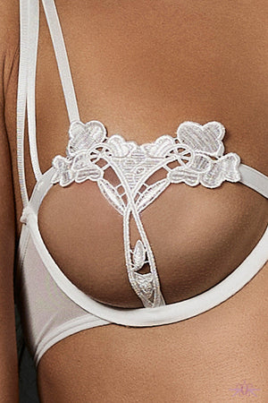 Gorgeous open cup bra with cut out design in guipure lace. This bra compliments your bust with delicate floral lace accents which adorn the underwired open cups. A slimline sheer strap to the rear with adjustable hook and eye fastenings enable the perfect fit. Pair with matching suspender belt and thong.