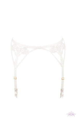 A delicately seductive ivory suspender belt from Bluebella. The guipure lace on this belt is beautiful and is based around triangular panels. It is elasticated around the waist with a simple classic strap that fastens with hook and eye. There are four adjustable suspender straps to hold your stockings securely in place.