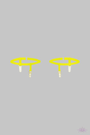 Two yellow Signature garters stamped with the Maison Close logo. These adjustable elasticated bands with gold accents are movable mini suspender straps for positioning on either side of the leg once the garter is adjusted.