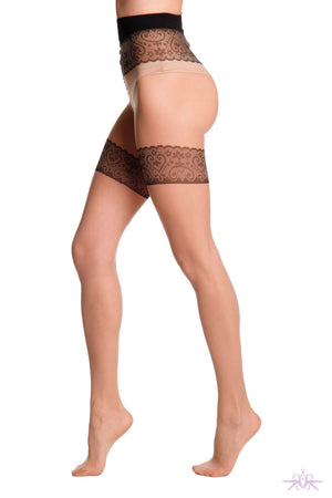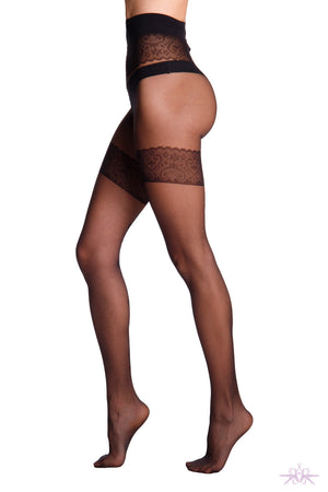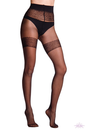 A stunning faux hold up tight from Trasparenze. These have a sheer faux hold up effect with seam of hearts. A delicate lace effect band sits on the thigh giving the hold up look and it is then finished with a decorative Lace band which is comfortable. These will surely add style and glamour to your outfit. Available in cosmetic and black or simply just black.