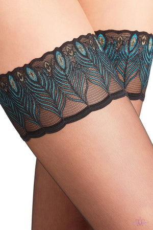 From Falke come these luxurious ultra transparent and ever popular hold ups, they are identical to the original Lunelle 8, except for the lace peacock feather design top, which has much more of a colourful shimmer. A strong silicone coating prevents them slipping. The 'barely-there' look adds a slight shimmer on your legs.