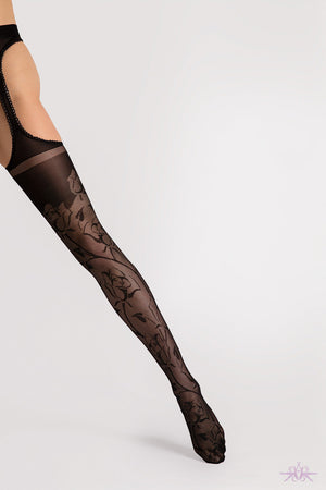 Rambling roses are the order of the day on these faux suspender tights from Fiore. Black floral motifs, intricate and rich, just like the inner world of your emotions adorn the legs. A sheer tight with the feeling of comfort next to your skin due to the increased elasticity from 3D technology.