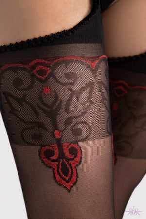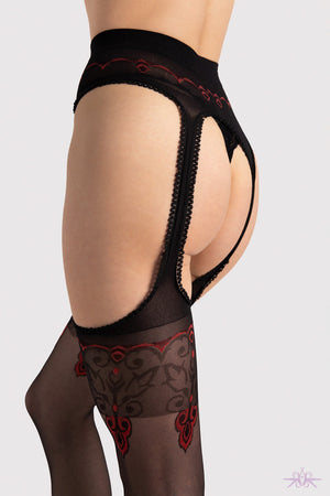 Love is in the air with these beautiful suspender tights from the Sensual collection at Fiore. A delightful pair of faux stockings with suspenders bestows the wearer in classic black and red motifs around the thigh and waist. A sheer tight with the feeling of comfort next to your skin due to the increased elasticity from 3D technology.