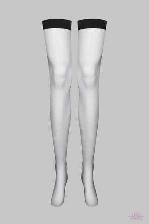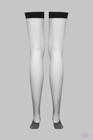 Introducing the Maison Close Sheer 6 Denier Stockings. Delicately crafted in Italy, these stockings are both elegant and versatile, allowing you to wear sandals and heels without any visible lines. Paired with a Maison Close suspender belt, they create a sleek and elongated silhouette. Expertly made by a renowned workshop for a luxurious feel.