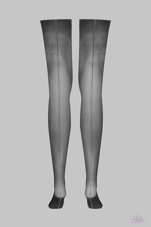 Experience the luxurious elegance of Maison Close with their signature suspender stockings. Made from fine, silky 20 denier voile, these black stockings feature delicate gold LUREX® stitching that adds a playful yet sophisticated touch to your outfit. Perfectly paired with a suspender belt for a flawless fit.