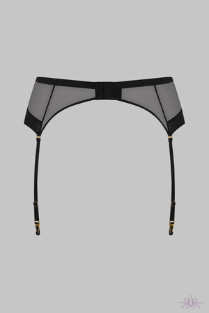 A seductive black suspender belt from the Corps a Corps collection at Maison Close. It features soft tulle with a sheer iridescent appearance and a clip fastening on the back.