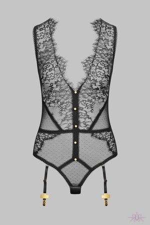 Chic and elegant is the thong body from the Inspiration Divine collection. It is a fabulous mix of fabrics that enhance the silhouette. The transparent floral lace and sensual mesh highlight the body beautifully. It shows off a sexy plunging neckline with a floral lace ruffle which embellishes the chest. Golden buttons bring a touch of colour and complete the look. The back is sheer decadent mesh. There are four removable and adjustable suspender straps with the signature gold cross attached.