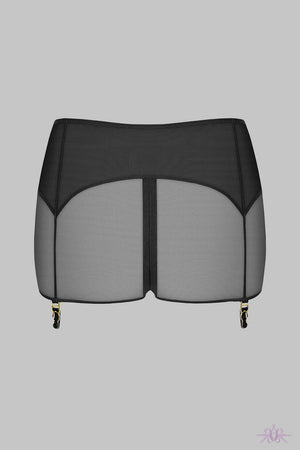 A openable shorty in black sheer mesh that will excite the senses. The lined belt with garter effect. Seamless sides. Two-way zipped crotch. Removable garter accessories.