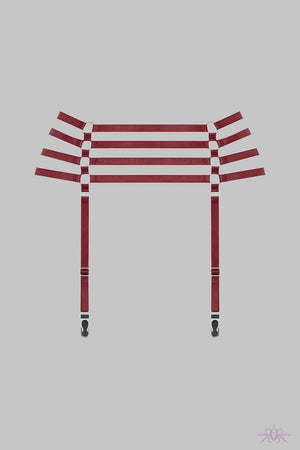 Enhance your lingerie with Maison Close's Les Fetiches burgundy garter belt. Clusters of silver rings and burgundy ribbons accentuate your nudity, while adjustable, removable straps call for stockings. It's the perfect accessory to complete your bold and stylish fetish chic look.
