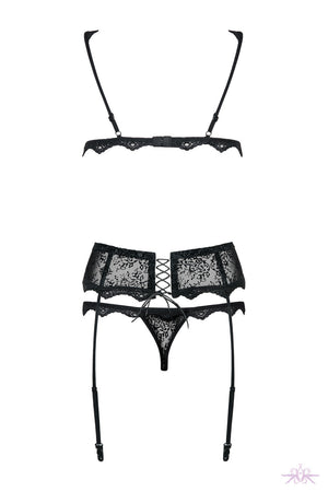 Indulge in pure seduction with the Obsessive Emperita 3pcs Set. This daring ensemble features a delicate lace bra, sultry garter belt, and matching thong, each piece adorned with an exquisite floral velvet pattern. The corset lacing detail on the back adds an irresistible touch of allure, designed to captivate and inspire desire. Crafted for the confident woman who knows her power, this refined collection merges elegance with undeniable sensuality.