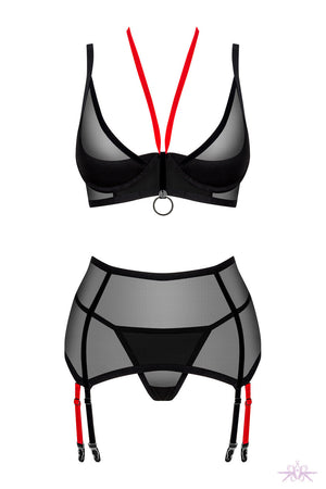 The three-piece Glandez set is perfect with the transparent fabric, surprising colourful details, an additional halter neck strap, and a laced garter belt. The underwired and padded cups support the bust and accentuate the curve. The red velvet straps are adjustable and removable to suit. The suspender belt has elegant lacing to the rear and hold the hips beautifully.