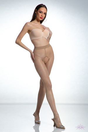 A seductive pair of crotchless 20 denier tights in beige. These beautiful glossy tights have an open crotch and are made from the finest Italian yarns. A comfort band and seams make these incredibly sumptuous to wear.