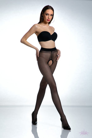 A seductive pair of crotchless 20 denier tights in black. These beautiful glossy tights have an open crotch and are made from the finest Italian yarns. A comfort band and seams make these so sumptuous to wear.
