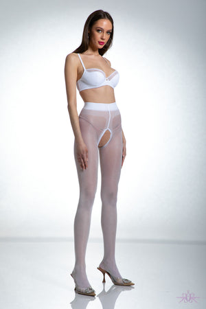 A seductive pair of crotchless 20 denier gloss tights in white. These beautiful shiny tights have an open crotch and are made from the finest Italian yarns. A comfort band and seams make these so sumptuous to wear.