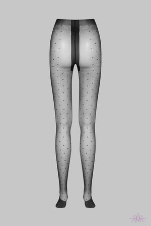 Introducing Maison Close Satin 10 Plumetis Tights. These gloss tights offer a sophisticated sheen and delicate Swiss dot detailing for an incredibly feminine look. The high, roll-up waist, shaped heels, and crotch gusset provide ultimate comfort. Made in Italy with no reinforcements on the feet, perfect for wearing open-toe heels.