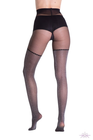 A stunning hold up effect tight from Trasparenze. These are sure to add sparkle and glamour to any outfit with the silver lurex thread on the leg. The sparkle stops at the thigh with a delicate dotted line. The thigh is sheer tulle and which leads to a comfortable waistband. You will feel amazing in these turn heads.