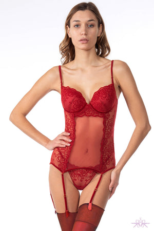 A luxurious lace corset from Valery Prestige with gorgeous embroidered tulle material decorated with embossed flocked velvet. The boned body creates a feminine look and is comfortable whilst enhancing the shape. There are four stretchy adjustable and also removable suspender straps making it a versatile piece. Refined elegance that plays on the suggestive transparency of your curves creating a sensual look.