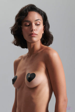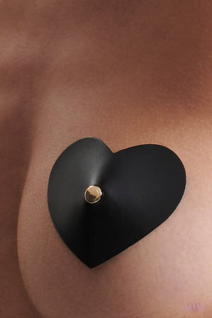 Take a risk and turn up the heat with Bluebella Salome Nipple Pasties! Crafted with a bold design and playful style, these pasties add a provocative touch to any outfit. Made with leather-look material and gold-tone hardware, they are secured by a gentle adhesive and have a heart shape for added playfulness.