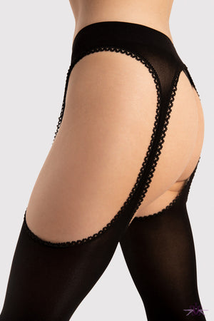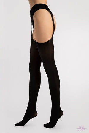 A lovely pair of opaque suspender tights from Fiore. The Diavolo tights are 60 denier with a delicate slim waist band with the imitation of suspender belt and stockings evident with the four straps leading to the stocking effect leg. A beautiful all in one tight.