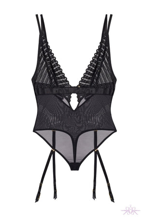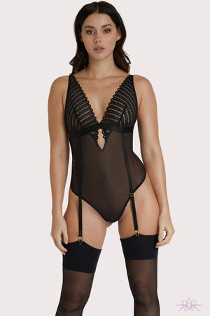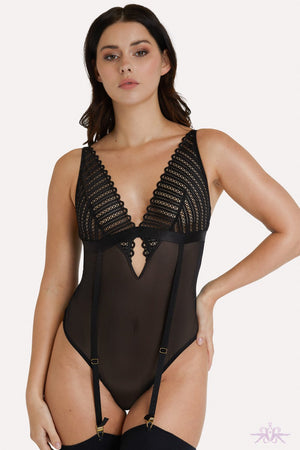 The gorgeous black suspender bodysuit is irresistibly seductive. It is crafted from sheer black mesh and non wired lace cups, with a cheeky cut out detail in the centre and 4 adjustable suspender straps.